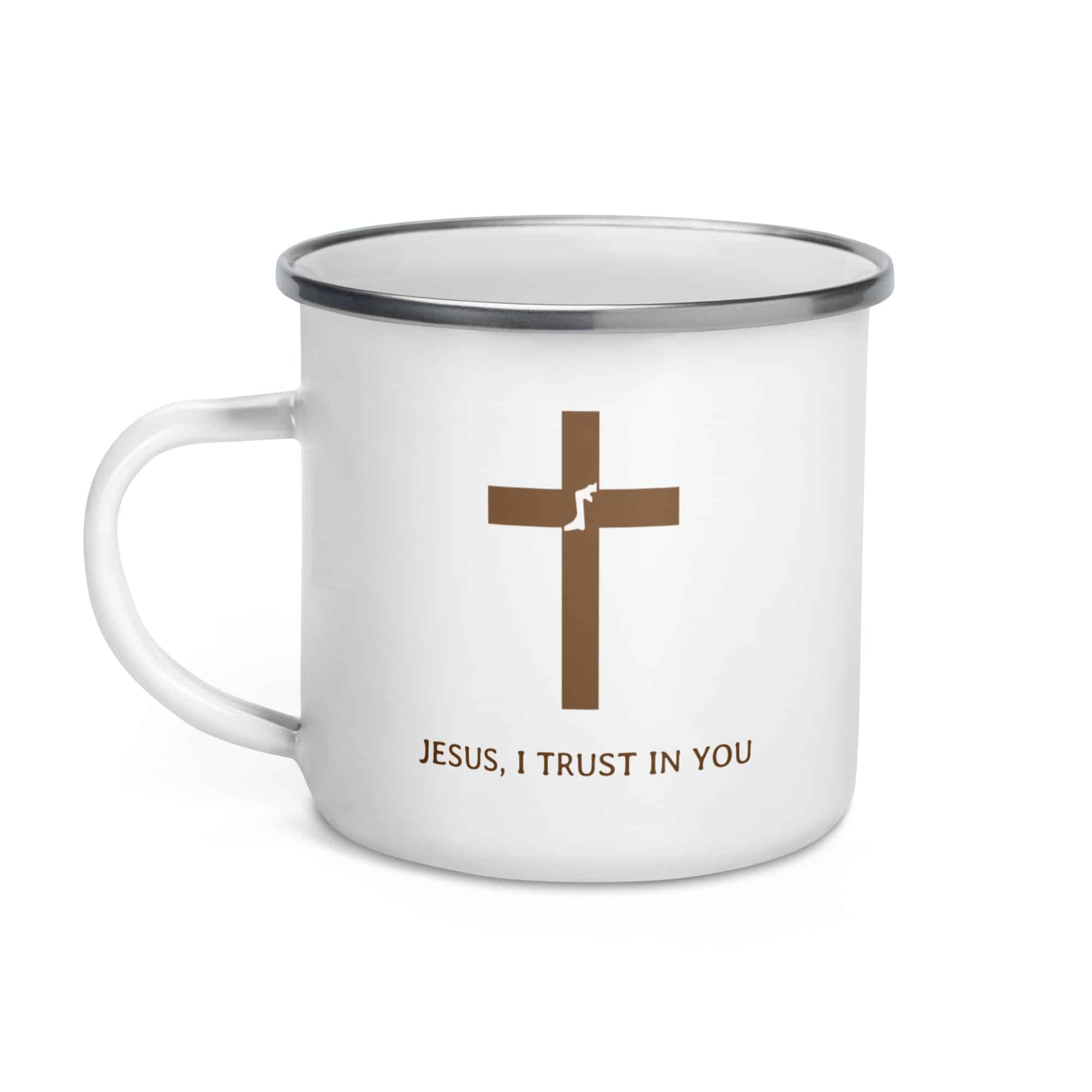 Christian coffee mug featuring the Broken Praying Cross and “Jesus I Trust in You.” A faith inspired mug designed to remind you every morning to pray